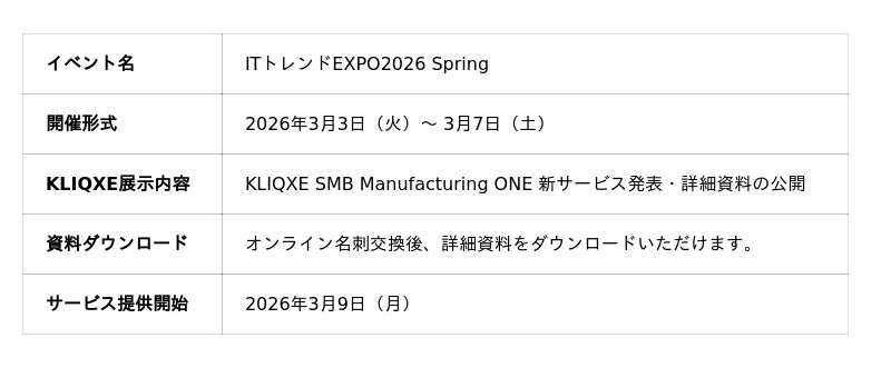 新サービス"KLIQXE SMB Manufacturing ONE" 発表 ─ 詳細は ITトレンドEXPO2026 Spring 展示サイトにて公開 ─