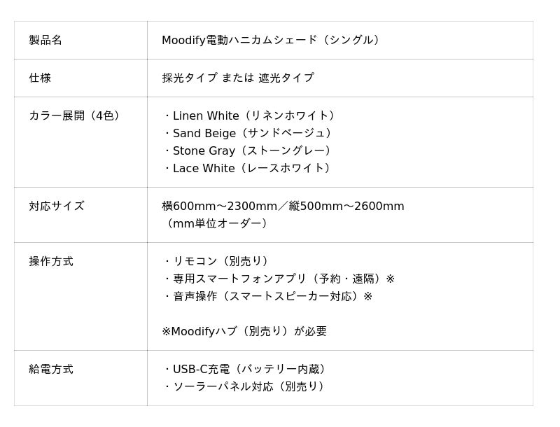 次世代スマートカーテンを展開する株式会社Moodify(本社:東京都荒川区、代表取締役CEO:松坂 星鏡)は、採光タイプまたは遮光タイプの2種類から選べる新モデル「Moodify(ムーディファイ)電動ハニカムシェード(シングル)」を3月1日より公式オンラインストア(https://moodify.jp/)にて発売します。カラー展開は4色で、価格は43,970円~81,610円(サイズオーダーメイドのため価格変動)です。