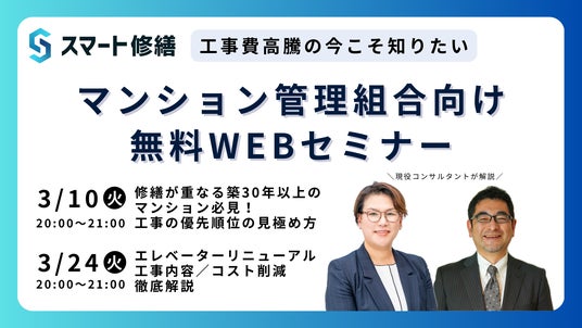 マンションやビルなど大型建物の修繕工事の見積、工事支援サービスを展開する株式会社スマート修繕(本社:東京都港区)は、マンション区分所有者様を対象にした無料のWebセミナーを開催します。