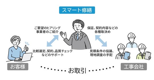 マンションやビルなど大型建物の大規模修繕など共用部工事の見積、工事支援サービス「スマート修繕」のほか、マンションの建替バリューを見える化する「スマート建替(ベータ版)」、大型建物の修繕工事の見積金額の査定を行う「スマート修繕顧問」、管理組合向けの金融商品の共同開発等、建物再生領域における事業を展開しています。専門知識のないマンション管理組合や不動産オーナーなどが、業界の事情に左右されることなく、フェアに取引できることを目指しています。