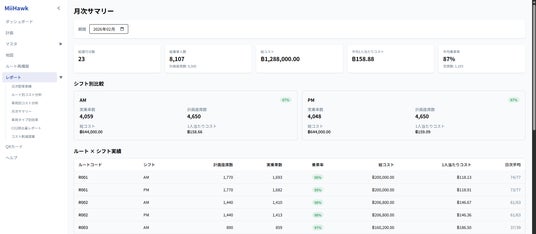 そこでMiiHawkでは、AI(機械学習等)に頼るのではなく、論理的かつ透明性の高い独自の『最適化アルゴリズム』を構築しました。これにより、条件を入力すれば必ず『最もコスト効率の良い配車の組み合わせ』が明確な根拠とともに導き出されます。