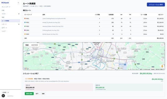 独自の最適化アルゴリズムにより配車業務の属人化とルートの形骸化を解消し、日系大手企業の実証実験において、従業員の送迎コストを最大40%(約1億円)の削減に成功しています。