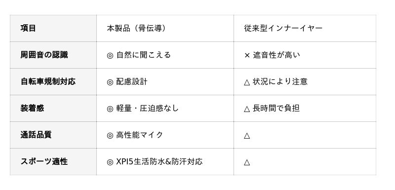 従来の密閉型イヤホンは高い遮音性を持つ一方で、車両音や警告音など重要な環境音を遮断してしまう可能性があります。音楽を楽しみたいというニーズと、安全確保という社会的要請。この二つを同時に満たす新たな選択肢として、骨伝導方式が注目されています。