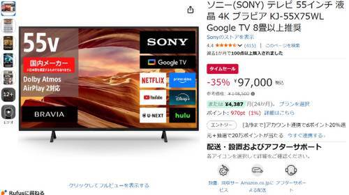ソニーの55型4K液晶テレビ「ブラビア KJ-55X75WL」がAmazonでタイムセール対象。参考価格148,500円のところ、35%オフの97,000円で販売中。
