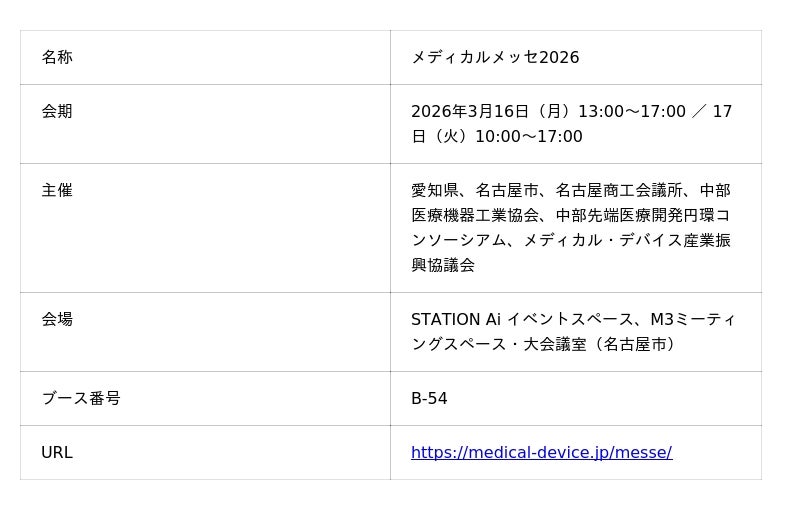 株式会社Berry(本社:東京都台東区、代表取締役:中野裕士)は、2026年3月16日(月)~17日(火)に名古屋・STATION Aiで開催される「メディカルメッセ2026」(ブース番号:B-54)に出展いたします。ブースでは、医療機器メーカー向けクラウド型eQMS『QMSmart』の実機デモを実施します。