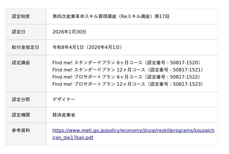 オンラインWebデザインスクール「Find me!(ファインドミー)」は、提供する4講座(スタンダードプラン6ヶ月・12ヶ月コース、プロサポートプラン6ヶ月・12ヶ月コース)が、経済産業省の定める「第四次産業革命スキル習得講座(Reスキル講座)」第17回認定講座として、2026年1月30日付で正式に認定されたことをお知らせいたします。