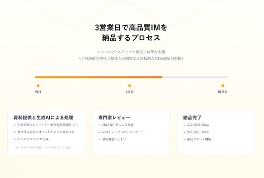 生成AIとM&A専門家によるレビューを組み合わせ、従来2~3週間、最長1か月ほどかかっていたIM作成を最短3営業日で納品します。
