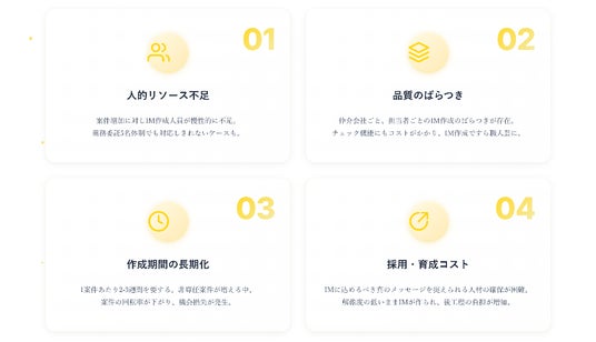 IMに込めるべき真のメッセージを捉えられる人材の確保が困難です。解像度の低いままIMが作られることで、後工程の負担が増加しています。