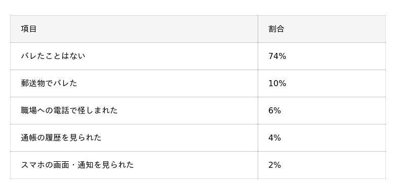 - 74%の人が借入が周囲に「バレたことはない」と回答。安心できる結果の一方で、10%が「郵送物」をきっかけに知られていることから、契約時の受取方法の選択が周囲に知られないための重要なポイントだと分かった。