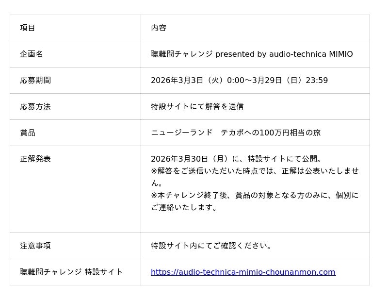 株式会社オーディオテクニカ(本社:東京都町田市、代表取締役社長:松下和雄)が展開する、聴こえをサポートするブランド「audio-technica MIMIO(オーディオテクニカミミオ)」は、2026年3月3日(火)の「耳の日」より、JAPAN MENSA会員でもある問題クリエイター監修の聴力にまつわる謎解きクイズ「聴難問チャレンジ」を開催いたします。