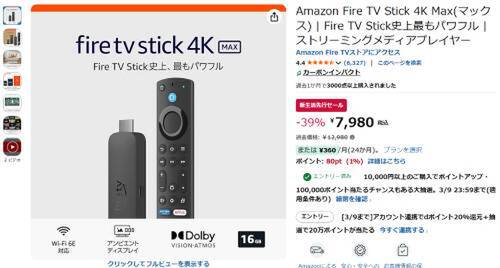 Amazonのストリーミング端末「Fire TV Stick 4K Max」が新生活先行セール対象。参考価格12,980円のところ、39%オフの7,980円で販売中。
