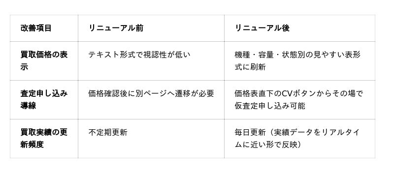 iPhone買取市場が実施したユーザーヒアリングでは、「掲載価格が古いと感じることがある」「価格を調べてから申し込みまでの手順が多い」「どの機種がいくらで売れるか一目でわかりにくい」という声が多く寄せられました。これらの課題に応えるため、情報鮮度・視認性・申し込みの利便性を一挙に改善するUI/UXリニューアルを実施しました。