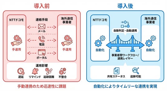本実証実験では、不具合発生時に、「何が起きたのか」「どのネットワークで発生したのか」「どのような対応が進められているのか」などを迅速に可視化し、従来手動で行っていたプロセスを自動化されたワークフローへと転換しました。これにより通信事業者は、より早く状況を把握することで正確な対応を進めることができ、お客さまが安心して通信サービスをご利用いただける環境の実現に貢献します。また、問題の早期検知と迅速な 解決が可能となることで、世界中の渡航者に対する国際ローミングサービス品質のさらなる向上につながります。