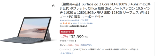 Microsoftの2-in-1ノートPC「Surface Go 2」Core m3搭載モデル(整備済み品)が、3月3日より始まったAmazonの「新生活先行セール」にて32,999円で販売中です。