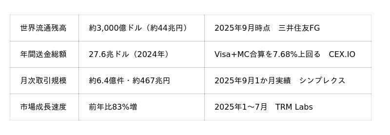2025年9月時点の世界の流通残高は約3,000億ドル(約44兆円)。2024年の送金総額は27.6兆ドルに達し、同年のVisa・Mastercardの合算取引高を上回りました。2025年9月の1か月だけで約6.4億件、約467兆円相当が動いています。