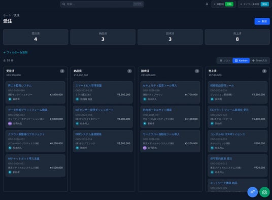 受注前後のフェーズ管理をボード表示で一目で把握。納品・請求・売上などの進捗が一目瞭然。