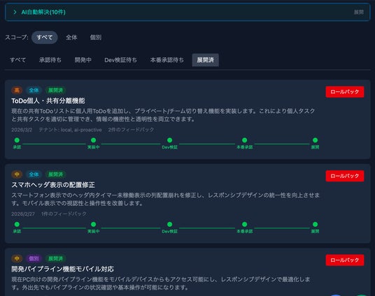 お客様からのフィードバックを業務コンサルタントが受け取り、AIによる自動実装で環境に反映。使い続けるほど、御社の業務に最適化されていきます。