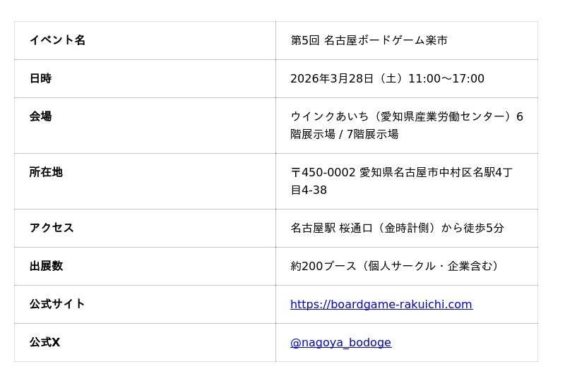 名古屋ボードゲーム楽市事務局(JELLY JELLY CAFE 名古屋大須店・名古屋駅西口店、ボードゲームフェスタまいたーん!、合同会社Funaneco)は、2026年3月28日(土)に愛知県産業労働センター「ウインクあいち」6階・7階展示場にて、ボードゲームを中心としたアナログゲームの即売イベント「第5回 名古屋ボードゲーム楽市」を開催いたします。