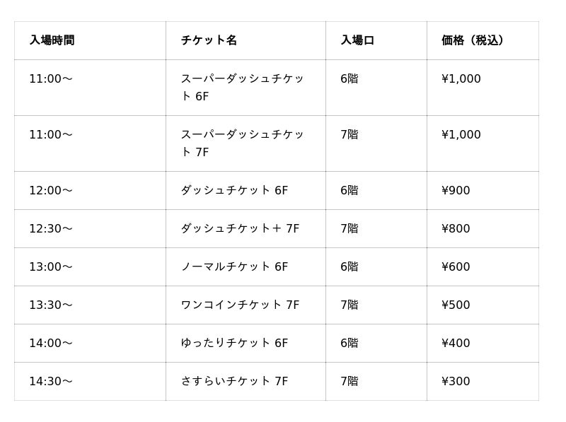 前売りチケット制。入場時間が早いほど価格が高く、遅い時間帯ほどお手頃になる「楽市システム」を採用しています。入口は6階・7階の2ヶ所あり、入場後は両フロアを自由に行き来できます。各チケット定員に達し次第販売終了。