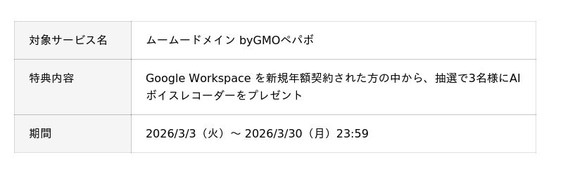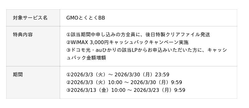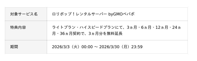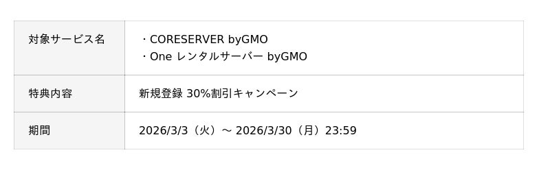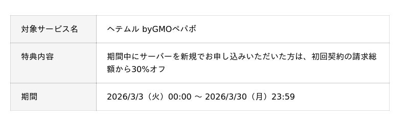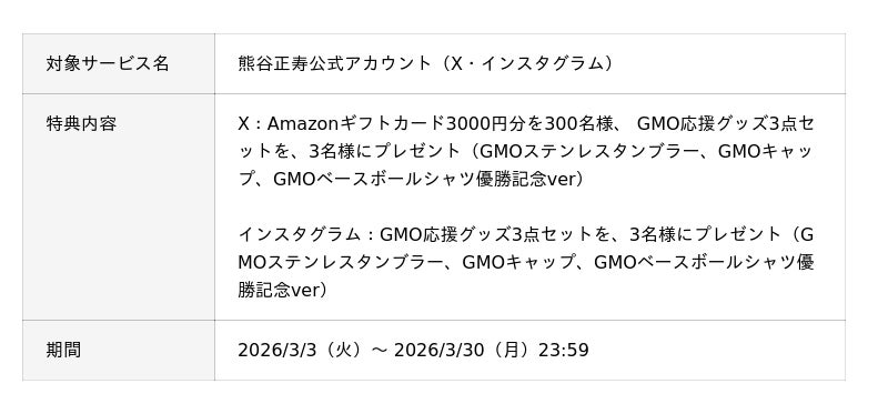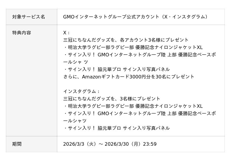 GMOインターネットグループ株式会社(代表取締役グループ代表:熊谷正寿)は、インターネット事業開始30周年の節目と、GMOインターネットグループ陸上部、所属プロゴルファー 脇元華選手、オフィシャルスポンサーの明治大学ラグビー部によるスポーツ3連勝への感謝を込めて、「30周年 3連勝・感謝キャンペーン」を本日2026年3月3日(火)より開始することをお知らせいたします。
