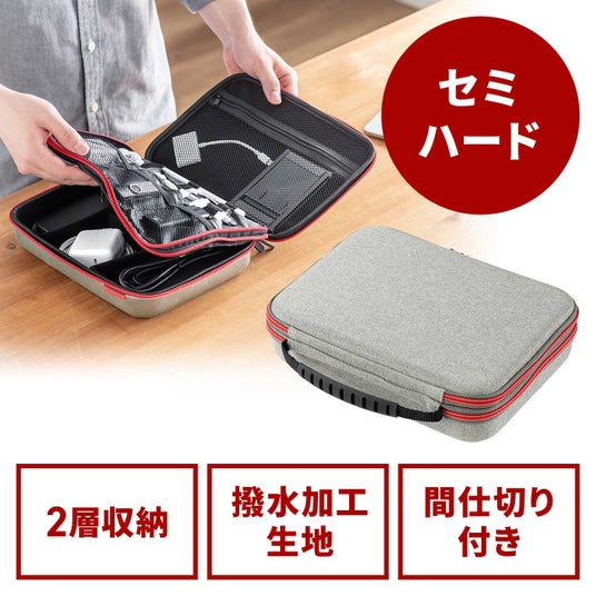本製品は出張・旅行の必需品をすっきり整理して持ち運べるセミハードガジェットポーチです。衝撃に強いEVA素材と撥水加工で大切な機器を保護。