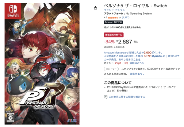 そこで紹介するのは、「ペルソナ5 ザ・ロイヤル」です。過去価格は4,050円ですが、Amazon新生活先行セールで34%オフの2,687円で購入できます。