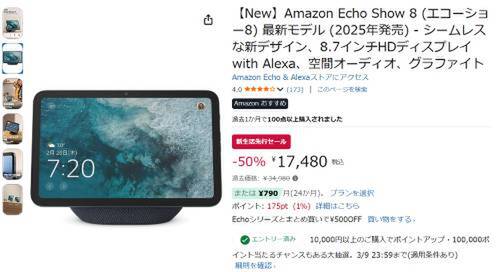 Amazonの8.7インチスマートディスプレイ「Echo Show 8(2025年発売)」が新生活先行セール対象。過去価格34,980円のところ、50%オフの17,480円で販売中。