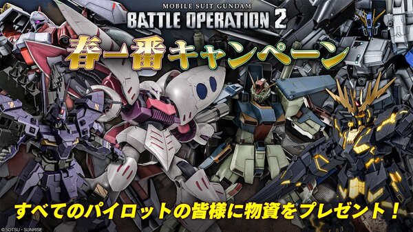 PlayStation版では、現在「春一番キャンペーン」を開催中。ログインすることで「キュベレイ LV3」や「ZZガンダム LV3」「FAZZ LV4」などがもらえるログインボーナスを開催しているほか、★2以上のMSが1機確定で入手できる「『春一番キャンペーン』毎日1回無料スペシャル抽選配給」も実施中だ。