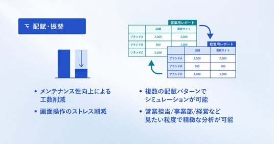 今回のリニューアルでは、ユーザー自らが「商品×取引先」などの多軸設定や、数百店舗単位に及ぶ配賦ロジックを自在に構築・維持できる柔軟性を実現しました※。また、複数の配賦パターンを一つのデータに対して実行することができるため、複数の配賦ロジックに基づいて、配賦後データの作成、多段階配賦実行時の途中段階までの実行データ作成や配賦ロジック変更時の影響比較を行うことが可能です。これにより、組織改編や新規事業の立ち上げといった経営の転換期においても、最新の配賦ロジックを用いた損益情報を即座に作成でき、常に最適な意思決定を行えます。