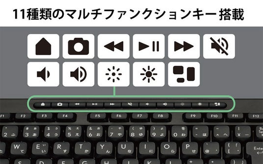 - メディアプレーヤーの起動、音量や明るさの調整などをワンタッチで実行できる独立した11種類のマルチファンクションキーを搭載しています。