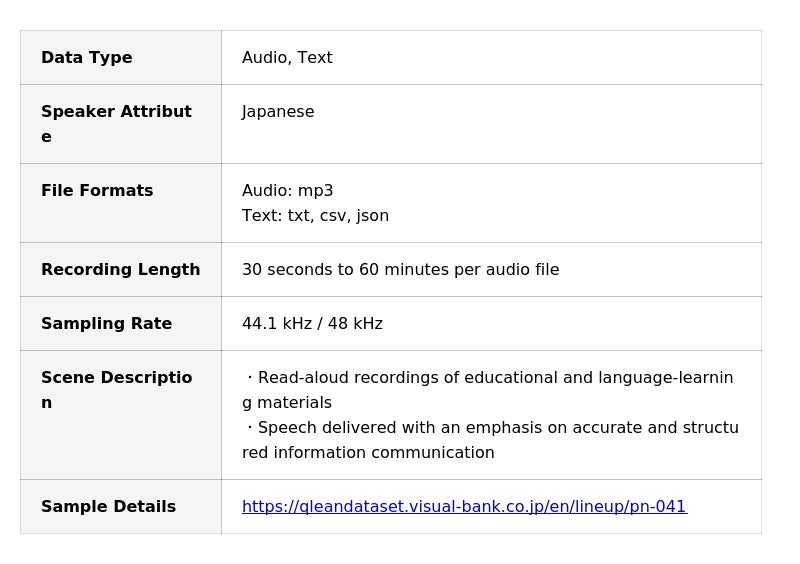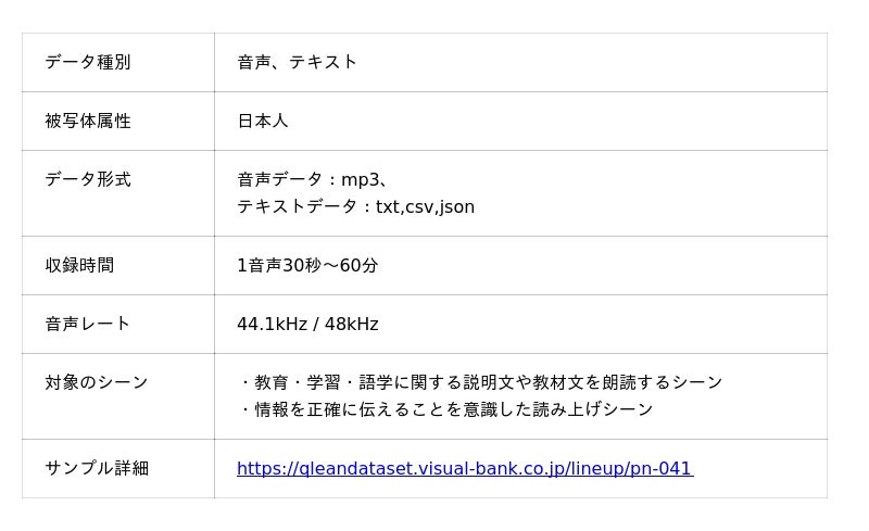 Visual Bank株式会社(東京都港区、代表取締役CEO 永井真之)は、傘下の株式会社アマナイメージズを通じて展開するAI学習用データソリューション「Qlean Dataset」において、ASR(自動音声認識)、NLP(自然言語処理)、LLM(大規模言語モデル)などの音声・言語系AI開発に用いられる「日本語・1話者・教育・語学テーマの朗読音声コーパスとトランスクリプト」の提供を開始しました。