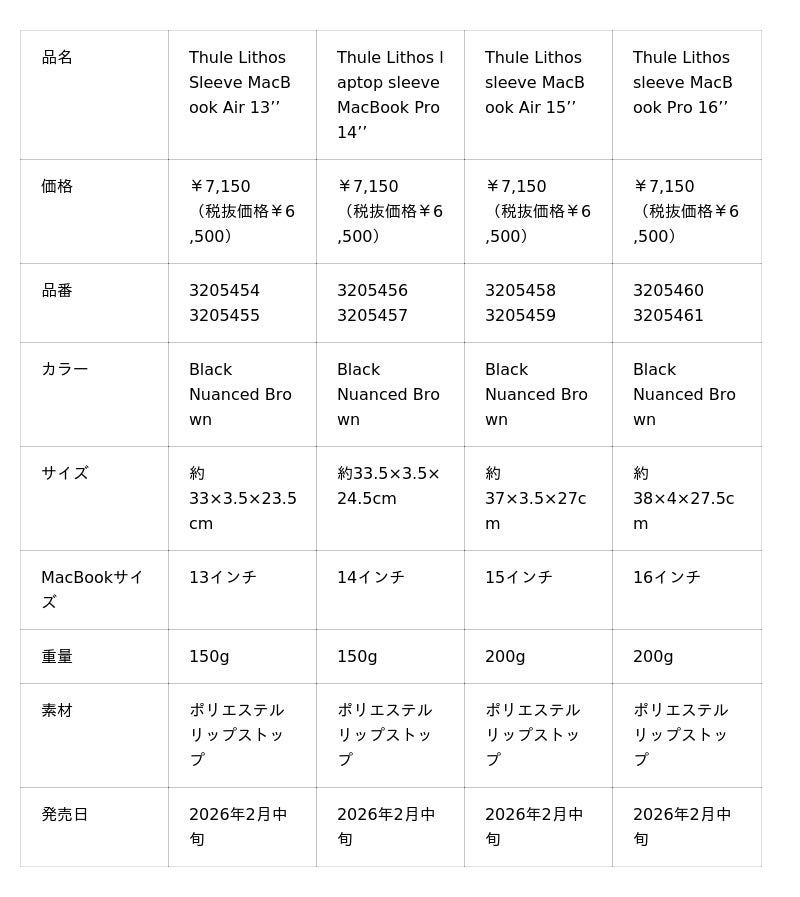 ゼット株式会社(本社/大阪市天王寺区、代表取締役社長/渡辺裕之)が取り扱うスウェーデンのブランド 『THULE』(スーリー)は、軽量丈夫でモダンなスタイルのコレクション【Thule Lithos】(スーリー リソス)から、最新のMacBook Pro/Airに対応したPC保護スリーブを2026年2月中旬に発売しました。13~16インチの4型、各2色を展開します。