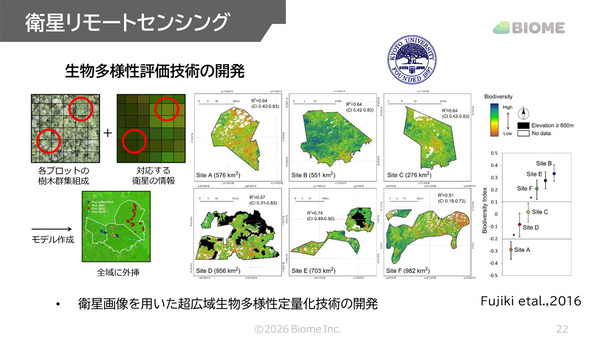 このフィールドワークでは、森林のどの場所にどのような種が生息しているのかを現地調査で記録し、それを衛星画像の情報と組み合わせて生物多様性の分布を地図として可視化する「衛星リモートセンシング」による技術を開発した。データを衛星画像と組み合わせることで、生物多様性が高い地域と低い地域を比較可能な形で評価することができる仕組みで、数値化(デジタル化)が難しかった生態系の状態を数値として表現することが可能になった。