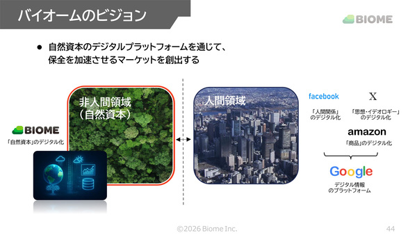 もし、環境を守ることで利益が生まれる仕組みを作ることができれば、生物多様性の保全は一気に進む可能性がある。破壊のスピードが速いのであれば、その力を逆向きに働かせればよい。環境保全を営利事業として成立させるモデルが作れれば、同じ仕組みを真似する企業が現れて広がっていく。その連鎖を生み出すことで、社会全体の構造を変えるという発想から生まれたのが、藤木氏が設立した生物多様性データプラットフォームを運営するバイオームだ。