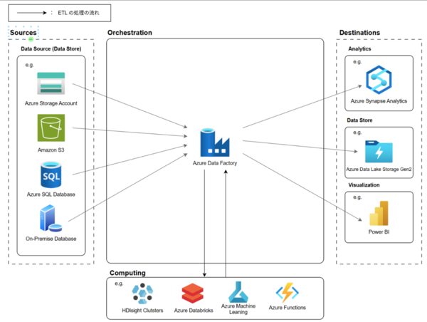 Azure Data Factory はこの Orchestration を担当し、複数のデータソースからデータを取得し、必要に応じて外部のコンピューティングサービスを使用してデータを変換・加工した上で、目的のデータストアに格納する ETL/ELT パイプラインを構築できます。