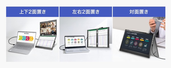 上下2面置き、左右2面置き、対面置きと3種類の設置方法に対応。対面置き時は上画面が向きを検知し自動で反転するため、商談や会議でもスムーズに利用可能。上下2面置きは省スペースでの作業に、左右2面置きは縦長のWebページや表計算、長文資料の確認に便利。L字型コネクターのUSB Type-Cケーブルを採用し、設置方法を変えても配線が邪魔になりにくい。