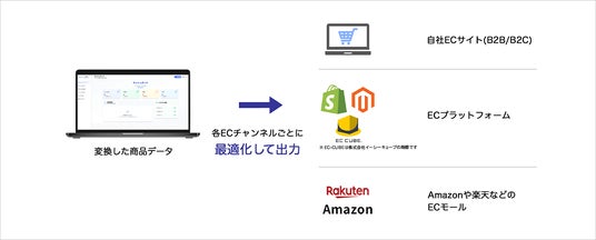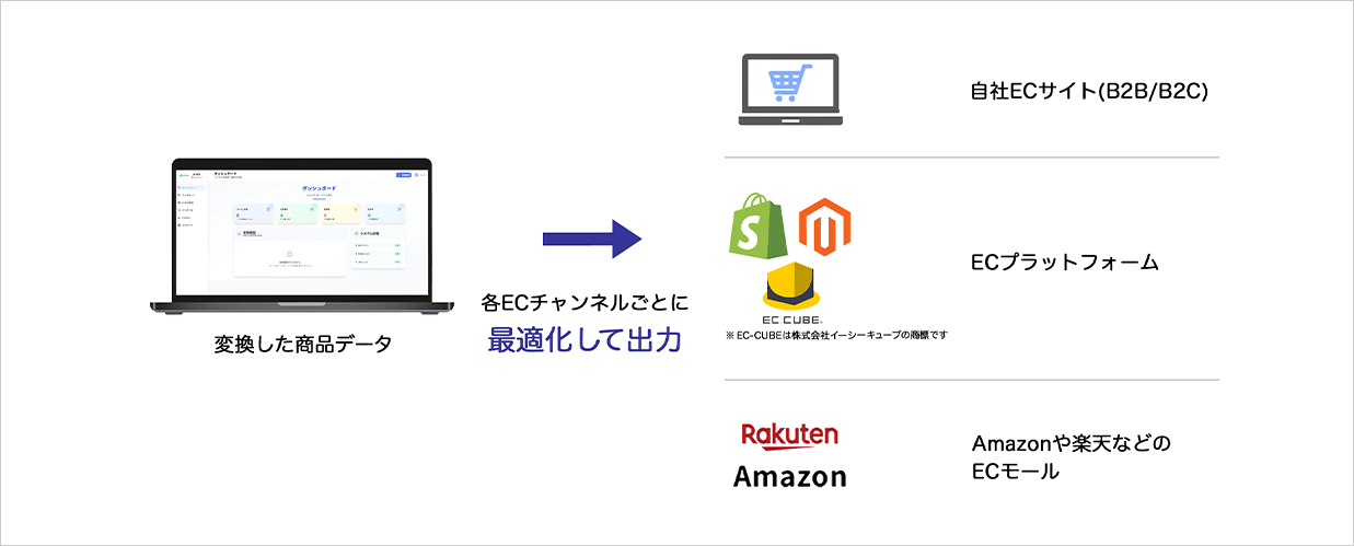 変換した商品データを各ECチャネルごとに最適化し、自社EC・モールへ出力可能