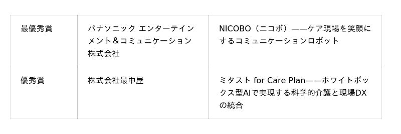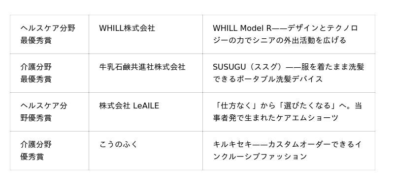 本アワードは、介護とヘルスケアの現場課題を可能性に変える製品、アイデア、サービス、表現を表彰します。プロダクトデザイン部門はヘルスケア分野と介護分野の用途別に審査し、最優秀賞にはWHILL株式会社の『WHILL Model R』と牛乳石鹸共進社株式会社の『SUSUGU』がそれぞれ選ばれました。ビジネスアイデア部門の最優秀賞は三和厨房株式会社の『テーブルコーデ』、AI部門の最優秀賞はパナソニック エンターテインメント&コミュニケーション株式会社の『NICOBO』、クリエイティブコンテンツ部門〈写真〉の最優秀賞は戸谷良和氏の『幸せな一日』が受賞しました。会期中は決勝進出者による体験展示が行われ、来場者投票も審査に反映。ビジネスアイデア部門とAI部門については、最終日の決勝ピッチコンテストを経て決定されました。