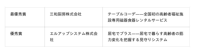 ビジネスアイデア部門 最優秀賞:テーブルコーデ(三和厨房株式会社)高齢者福祉施設専用の磁器食器レンタルサービス。食器の購入・管理・廃棄に伴う施設側の負担を解消しながら、美しい磁器の食器で「食べる喜び」を守るビジネスモデルです。独自のセラミック技術を活かした専用食器を開発。近畿2府4県を中心に継続契約率92%を記録し、全国展開を見据えています。