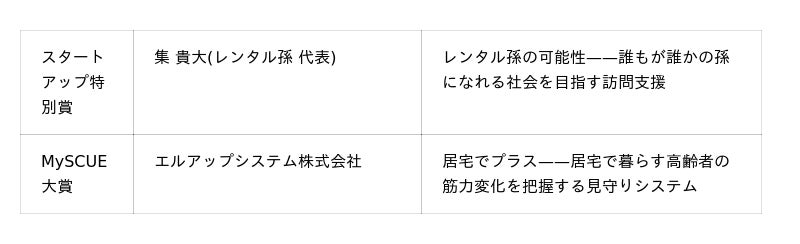 「誰もが誰かの孫になれる」をコンセプトに、若者が高齢者の自宅を訪問し、会話や外出の付き添い、スマホの使い方支援などを行う訪問支援サービス。介護保険の枠組みでは対応できない「ちょっとした困りごと」に応え、高齢者の孤立防止と若者の雇用創出を同時に実現。世代間交流が新しい社会インフラとなる可能性が評価されました。