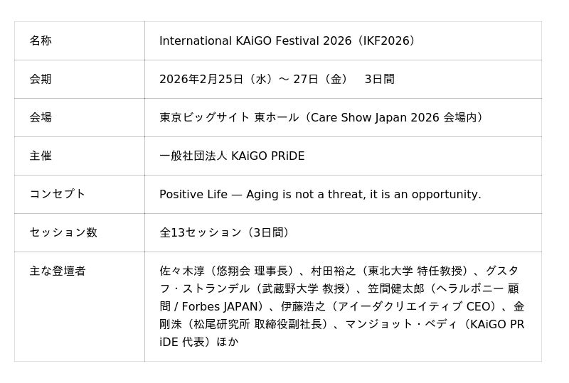 「International KAiGO Festival」は、介護を中心に人々のポジティブ・ライフを創出するプレイヤーたちが集い、経済・社会を結ぶ新しいエコシステムを共創するプラットフォームです。スタートアップ、企業、投資家、政策立案者、そして現場の介護職が集い、KAiGOプレナーシップ(介護から未来を切り拓く起業家精神)のもとに新しい発想を社会実装へとつなげます。