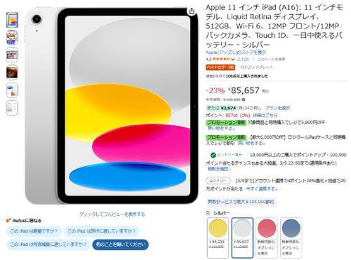 Appleの「11インチiPad(A16/512GB・Wi-Fiモデル)」がAmazonで割引対象。参考価格110,800円のところ、23%オフの85,657円で販売中。