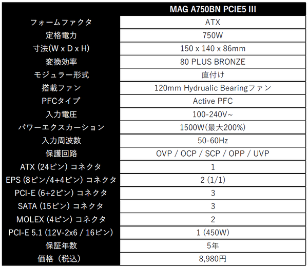 MSI、ATX 3.1対応750W電源「MAG A750BN PCIE5 III」発売 価格8,980円の高コスパモデル