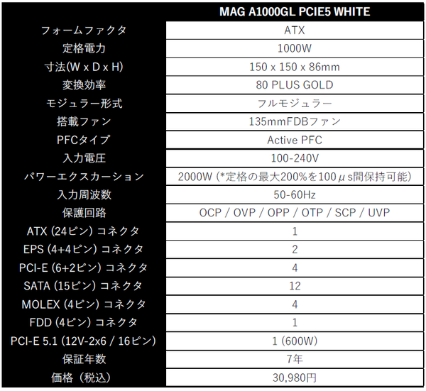 この「MAG A1000GL PCIE5 WHITE」は、PCIe 5.1およびATX 3.1に対応し、80 PLUS GOLD認証を取得した高性能なATX電源ユニットだ。最大の特徴は、新たな12V-2x6コネクタが黄色で視認しやすく、挿し込み具合を一目で確認できる安心設計。また、筐体やモジュラーケーブル、コネクタをすべてホワイトで統一しており、ホワイトPCを構築したいユーザーに最適な選択肢となっている。