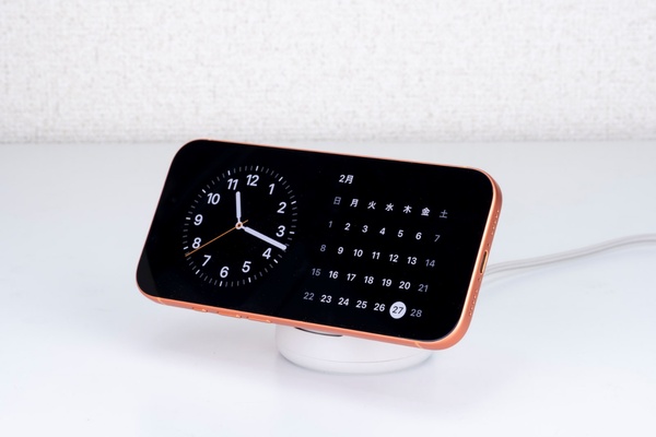 iPhoneを横向きに吸着させれば、iOSの「スタンバイ」モードを活用したスマートな置き時計としても機能。本体はずっしりとした重量感があり、強力な磁石でiPhoneを固定したまま操作しても、スタンドが動くことなく安定してタイピングやスワイプ操作を行える。iPhoneのケースは5mmまで対応している。