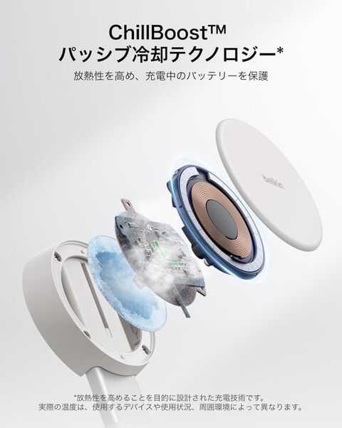ワイヤレス充電の課題である熱問題についても、独自のパッシブ冷却テクノロジー「ChillBoost」を搭載し、iPhoneの温度上昇による充電量の低下を防ぎ、安全かつ高速な充電を維持する。さらに、過電圧保護などの安全機能を備えており、厳格な試験プロセスと合わせて、高い信頼性を実現している。
