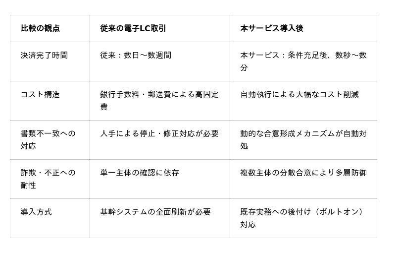 本サービスがもたらす価値は、単なる「効率化」ではなく、貿易金融における信頼の構造そのものの再定義にあります。