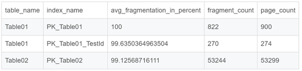もし、このような結果が確認できた場合にはインデックスの再構築実施可否の検討が必要です。