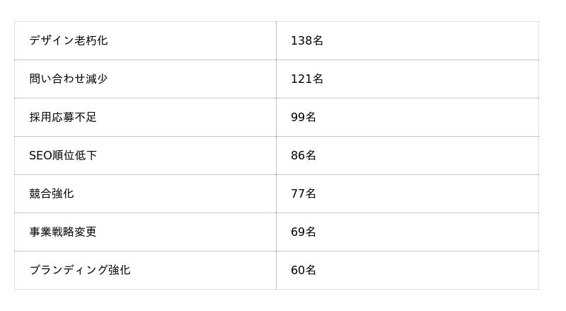 つまり、多くの企業が“見た目の刷新”を入り口にリニューアルを実施する一方で、本質的に解決したいのは「集客」や「成果」であることが明らかになりました。