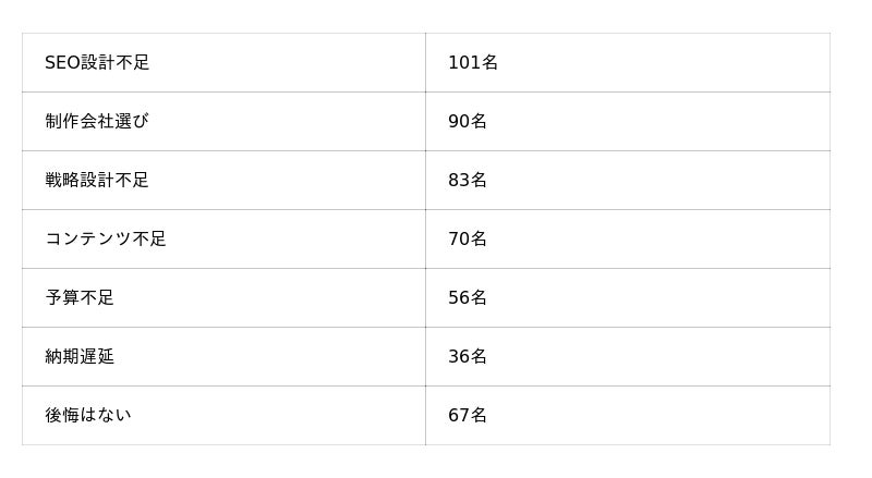- リニューアル後の後悔としては「SEO設計不足(101名)」が最多
